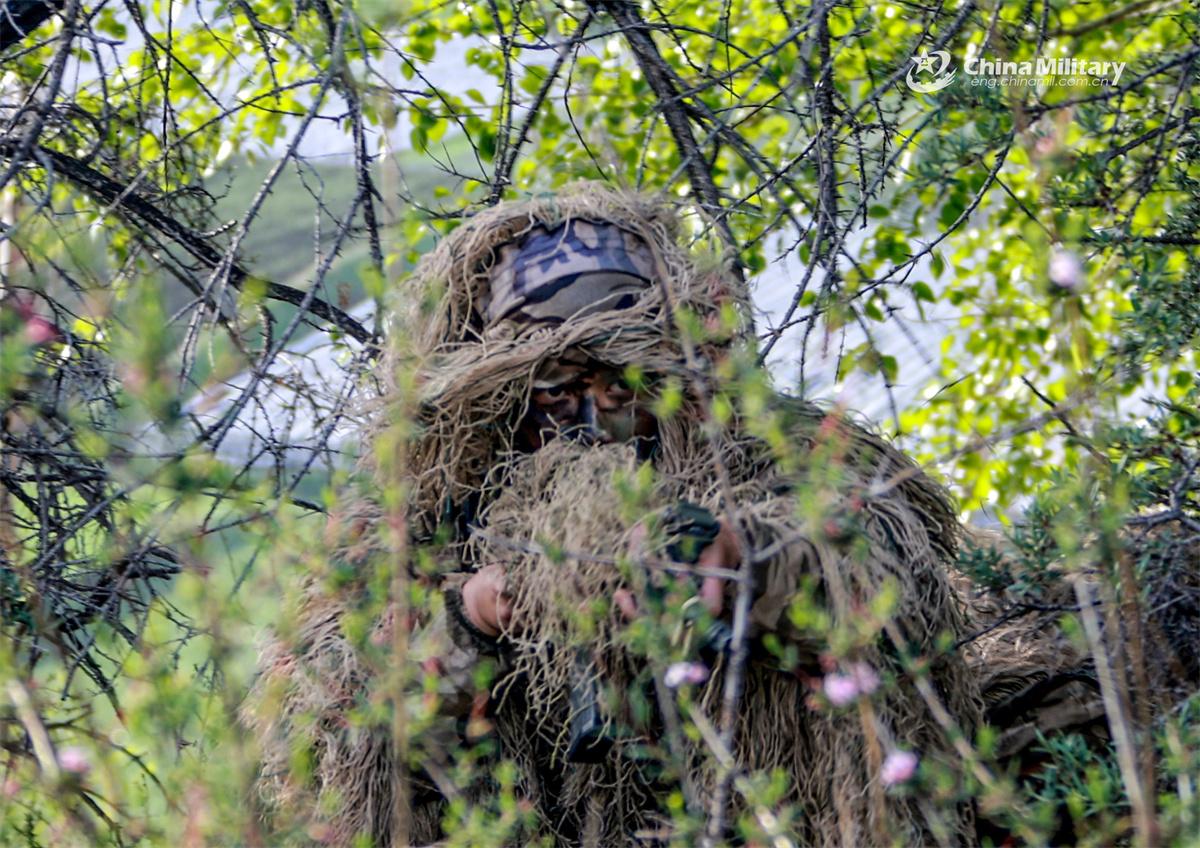 A sniper in ghillie suit assigned to a brigade under the Chinese PLA 76th Group Army sights in on targets through scope during a tactical training exercise on June 12, 2025. (eng.chinamil.com.cn/Photo by Cui Huoyang)