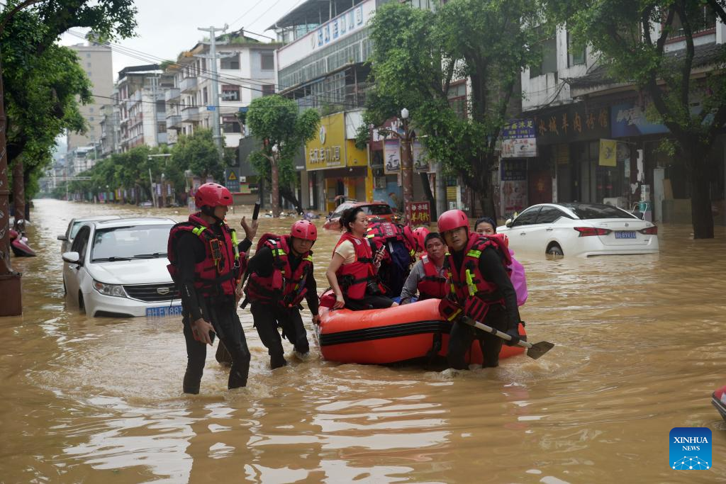 Rescuers evacuate residents from flood-affected area in Rongjiang County, southwest China's Guizhou Province, June 24, 2025. Continuous heavy rainfall and upstream inflows have triggered severe flooding in two counties of Guizhou Province in southwest China, prompting mass evacuations.