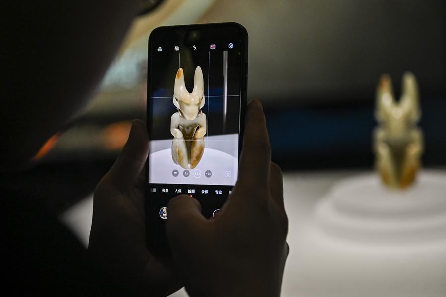 A visitor takes photos of an exhibit during a media preview of the exhibition titled "Legends of Dragon: The Ancient Civilization of Hongshan Culture" at the Shanghai Museum East in east China's Shanghai, June 25, 2025. (Photo by Chen Haoming/Xinhua)