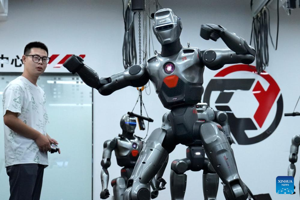 A staff member debugs a humanoid robot at a robot company in Shenzhen, south China's Guangdong Province, June 25, 2025. In recent years, Guangdong Province has taken various measures to develop the robot industry. The application and promotion of embodied artificial intelligence robots has been gaining speed in Guangzhou and Shenzhen, and a provincial embodied artificial intelligence robot innovation center was established in Shenzhen. In addition, cities like Foshan, Dongguan and Zhuhai are encouraged to give full play to their manufacturing advantages to build robot production bases.