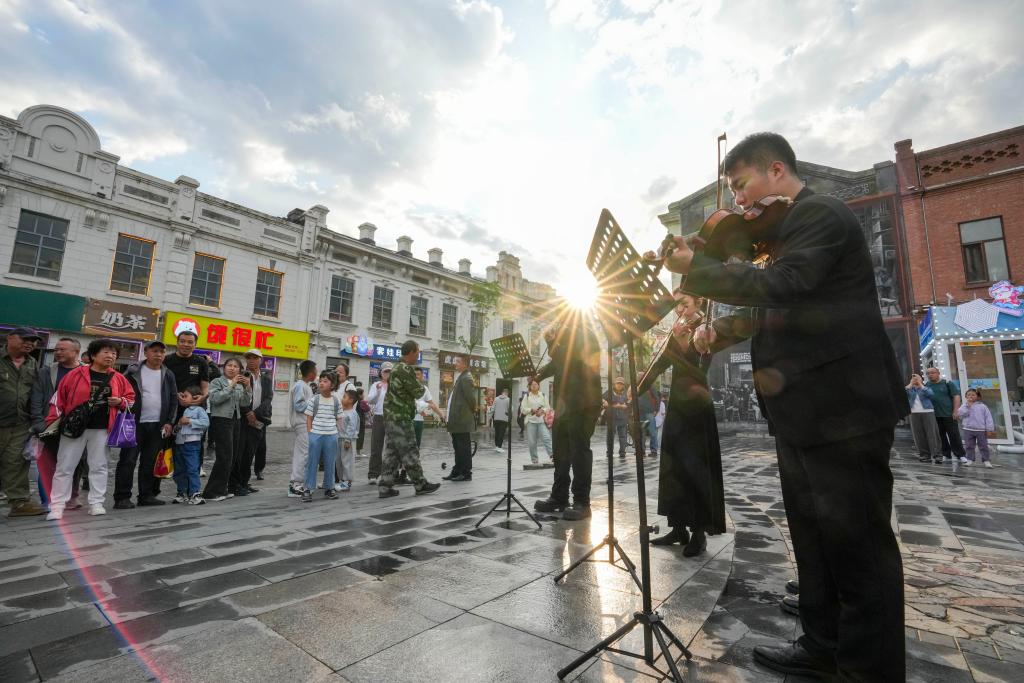 People watch a performance at a historical and cultural district in Harbin, northeast China's Heilongjiang Province, June 7, 2025. Harbin is often described by its residents as a city that emerged in tandem with the railway. Iconic buildings such as the St. Sophia Cathedral stand as evidence of European migration, trade and culture that dated back to the late 19th and early 20th centuries after the construction of the Chinese Eastern Railway in 1898. Records show Harbin was once home to people from over 30 countries. (Xinhua/Wang Jianwei)
