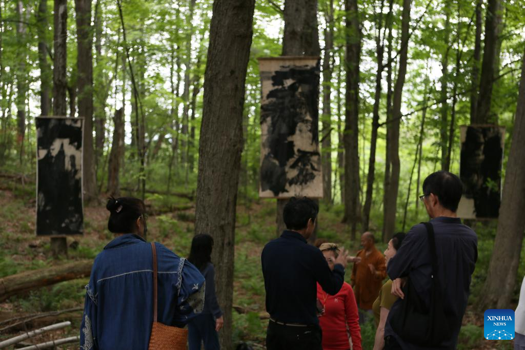 Visitors talk in front of a work during an outdoor exhibition "Solar Terms: Contemporary Ink Art Event" in Lenox, Massachusetts, the United States, on June 28, 2025. In a wooded corner of Eastover Estate & Eco-Village, a dozen tall scrolls, roughly a meter wide and three meters high, sway quietly in summer breeze, having been visibly transformed by rain, snow, sunlight and time since they were installed one year ago. The scrolls were painted on rice paper, affixed to durable non-woven fabric, and then framed and suspended between trees in the forest of the U.S. state of Massachusetts. (Xinhua/Zhang Fengguo)
