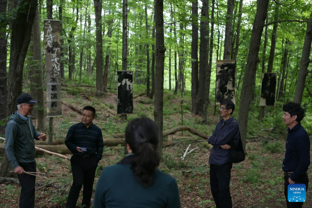 Chinese painter Lan Zhenghui (3rd L) introduces his work during an outdoor exhibition "Solar Terms: Contemporary Ink Art Event" in Lenox, Massachusetts, the United States, on June 28, 2025. In a wooded corner of Eastover Estate & Eco-Village, a dozen tall scrolls, roughly a meter wide and three meters high, sway quietly in summer breeze, having been visibly transformed by rain, snow, sunlight and time since they were installed one year ago. The scrolls were painted on rice paper, affixed to durable non-woven fabric, and then framed and suspended between trees in the forest of the U.S. state of Massachusetts. (Xinhua/Zhang Fengguo)