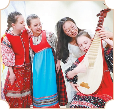 Russian students learn to play the pipa, a pear-shaped stringed instrument in China, in Manzhouli, north China's Inner Mongolia Autonomous Region. (Photo/Wang Huayong)