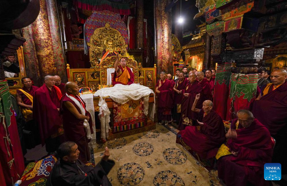 Panchen Erdeni Chos-kyi rGyal-po leads a sutra chanting ceremony at Jokhang Temple in Lhasa, southwest China's Xizang Autonomous Region, July 1, 2025. Panchen Erdeni Chos-kyi rGyal-po on Tuesday visited Jokhang Temple, the most revered monastery in Lhasa, capital of southwest China's Xizang Autonomous Region. (Xinhua/Jigme Dorje)