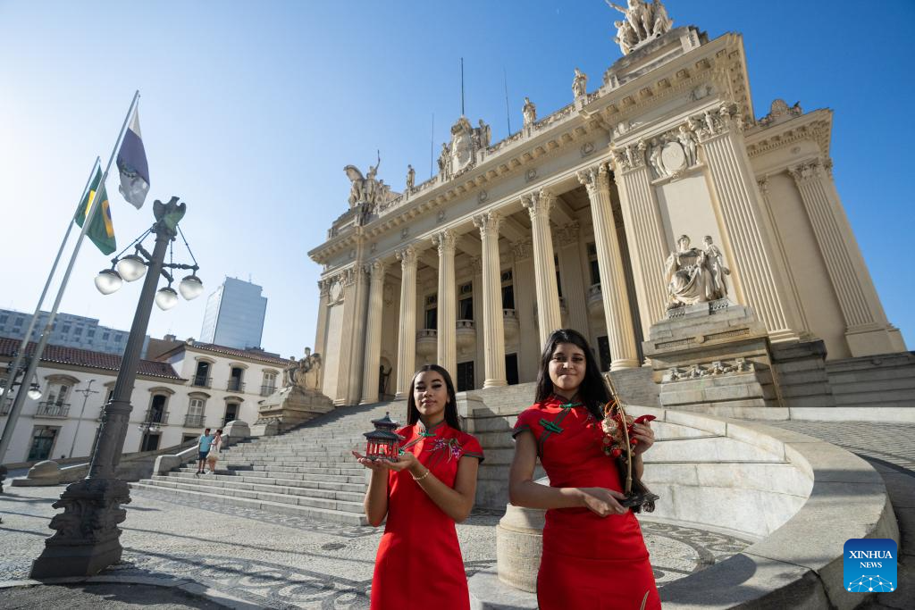 Volunteers dressed in traditional Chinese attire showcase crafts featuring Chinese elements during an exposition of innovation in traditional craftsmanship of the east China's city of Hangzhou at Tiradentes Palace in Rio de Janeiro, Brazil, June 30, 2025. The event showcased a variety of Chinese traditional crafts and their innovative expressions to the Brazilian public through demonstrations and interactive experiences. (Xinhua/Wang Tiancong)