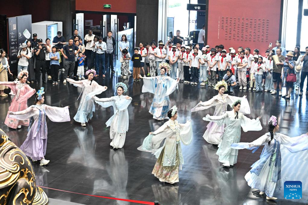 Performers perform at a museum featuring Han Dynasty (202 BC-220 AD) tombs in Xuyi, east China's Jiangsu Province, July 2, 2025. The museum of Han king's mausoleum at Dayun Mountain in Xuyi stages several featured exhibitions in this summer holiday to attract people to visit and learn about history knowledge. (Xinhua/Ji Chunpeng)