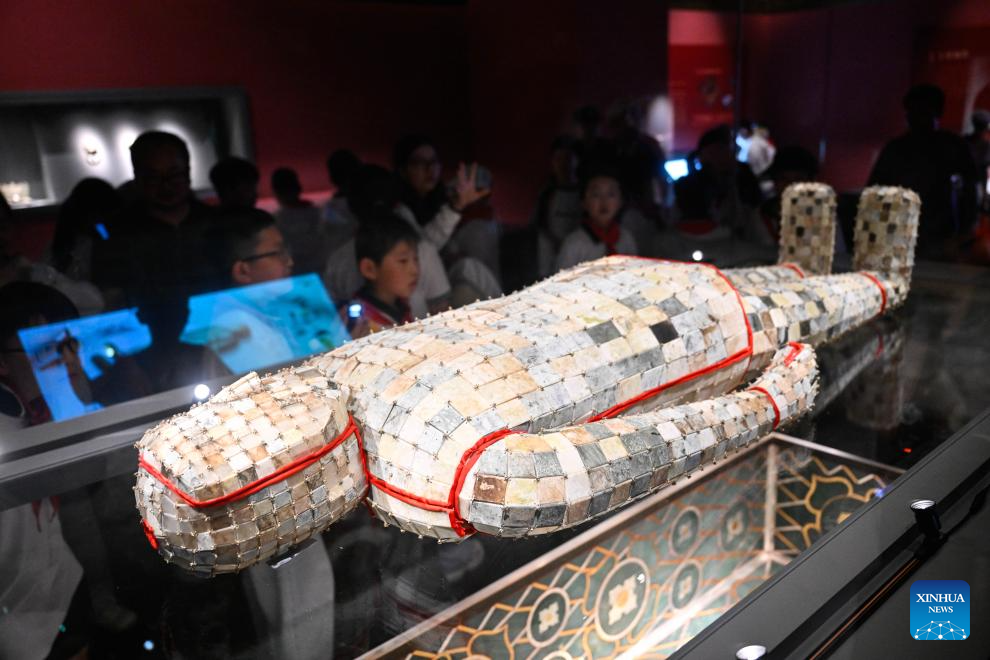 This photo taken on July 2, 2025 shows a jade suit with gold strings at a museum featuring Han Dynasty (202 BC-220 AD) tombs in Xuyi, east China's Jiangsu Province. The museum of Han king's mausoleum at Dayun Mountain in Xuyi stages several featured exhibitions in this summer holiday to attract people to visit and learn about history knowledge. (Xinhua/Ji Chunpeng)
