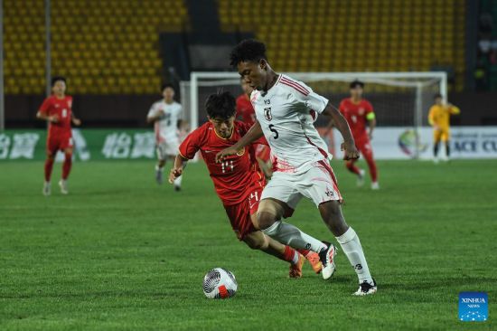 Chimezie Kai Ezemuokwe (R) of Japan competes during the CFA Team China Shenyang Peace Cup International Tournament 2025 football match between the U16 men's teams of China and Japan in Shenyang, northeast China's Liaoning Province, July 4, 2025. (Xinhua/Pan Yulong)