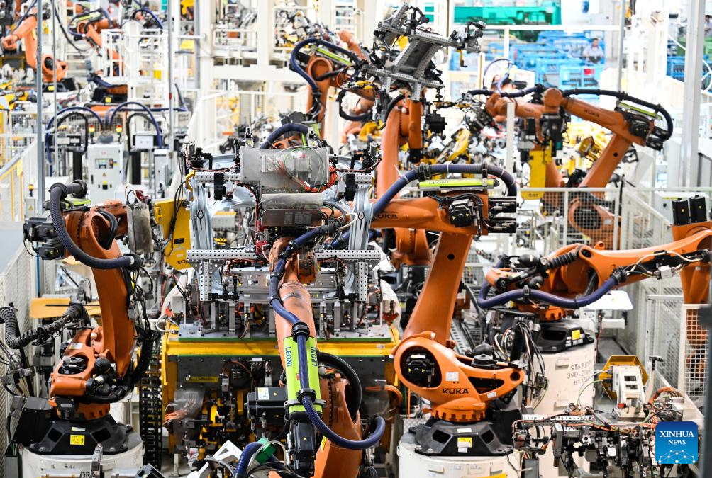 Robotic arms operate inside a welding workshop at the north China base of FAW-Volkswagen in north China's Tianjin, July 7, 2025. In recent years, Tianjin has been committed to building smart factories and accelerating the deep integration of the digital economy with the real economy. As of now, the city has established a total of 400 smart factories and digital workshops, continuously promoting the digital transformation of its manufacturing sector. (Xinhua/Zhao Zishuo)