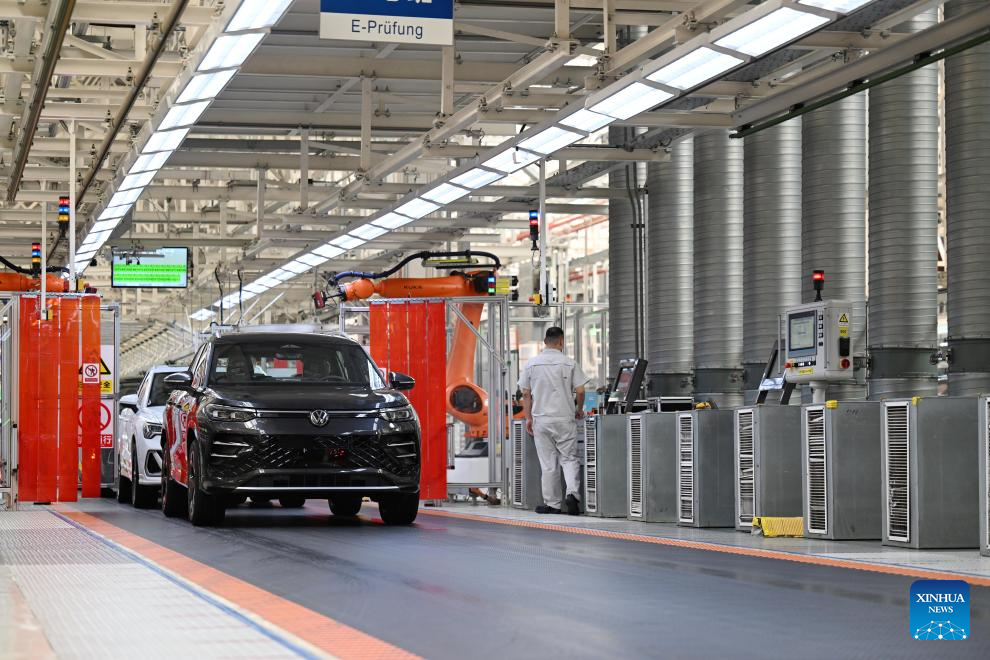 Vehicles roll off the production line at the assembly line of the north China base of FAW-Volkswagen in north China's Tianjin, July 7, 2025. In recent years, Tianjin has been committed to building smart factories and accelerating the deep integration of the digital economy with the real economy. As of now, the city has established a total of 400 smart factories and digital workshops, continuously promoting the digital transformation of its manufacturing sector. (Xinhua/Zhao Zishuo)