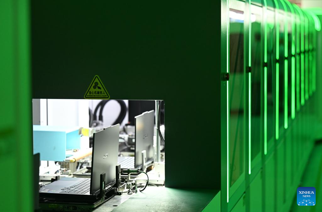 This photo taken on July 4, 2025 shows the laptop production line of the carbon-neutral smart manufacturing factory of Lenovo in north China's Tianjin. In recent years, Tianjin has been committed to building smart factories and accelerating the deep integration of the digital economy with the real economy. As of now, the city has established a total of 400 smart factories and digital workshops, continuously promoting the digital transformation of its manufacturing sector. (Xinhua/Zhao Zishuo)