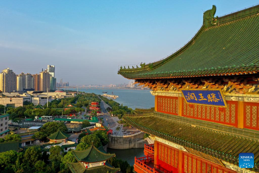 An aerial drone photo taken on July 7, 2025 shows a view of the Tengwang Pavilion scenic area in the morning light in Nanchang City, east China's Jiangxi Province. The Tengwang Pavilion, the 29th iteration in its 1,400-year history, features intricately carved beams and vibrantly painted rafters. It stands majestically along the banks of the Ganjiang River, which winds through eastern China's Jiangxi Province. About 90 percent of the scenic area has been open to the public for free as of Jan. 1 this year when a northward expansion project was fully completed. (Xinhua/Liu Jinhai)