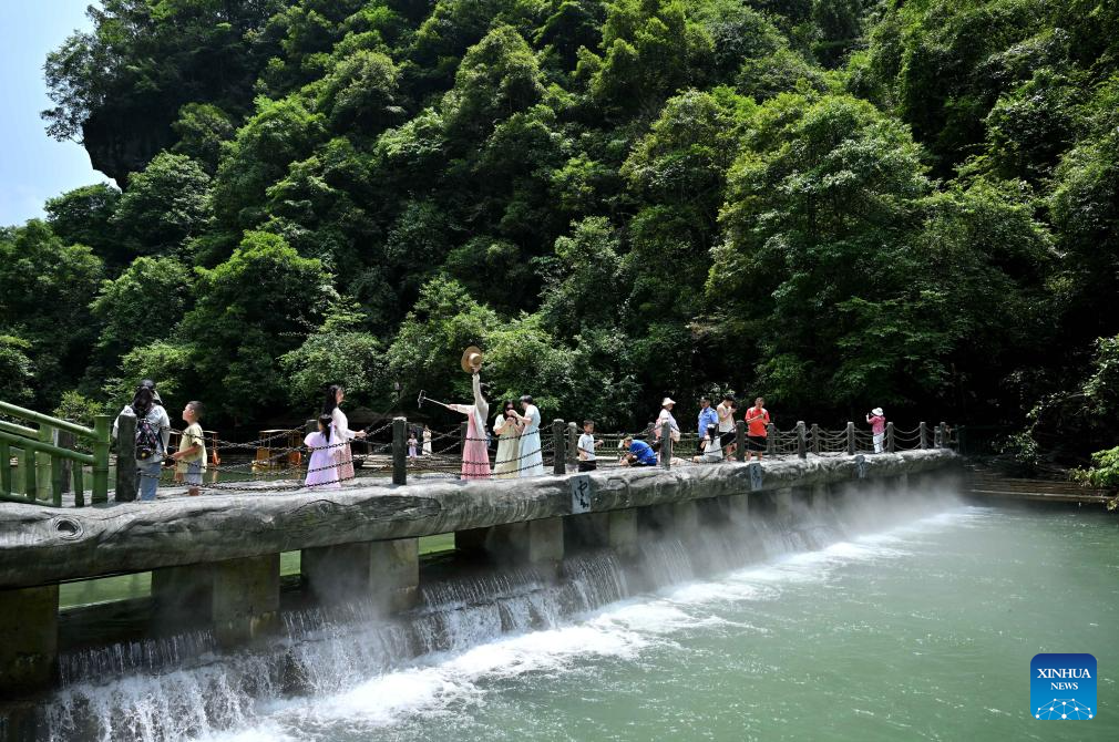 Tourists have fun at Pingshan canyon in Hefeng County, Enshi Tujia and Miao Autonomous Prefecture, central China's Hubei Province, July 9, 2025. The unique canyon landscape and limpid water make the Pingshan Canyon an attractive destination for tourists. (Xinhua/Wu Zhizun)