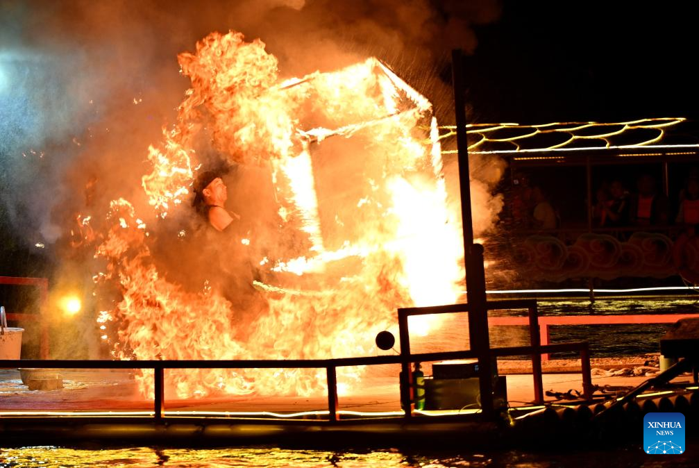 A folk artist performs on the Gongshui River in Xuan'en County, Enshi Tujia and Miao Autonomous Prefecture, central China's Hubei Province, July 9, 2025. In recent years, Xuan'en County of central China's Hubei Province has promoted nighttime tourism around the Gongshui River, which runs through the county. Activities and shows ranging from bamboo raft rides to molten iron fireworks attract visitors to enjoy the charm of the county under the lights. (Photo by Song Wen/Xinhua)
