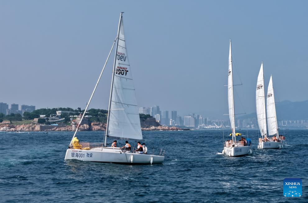 A drone photo taken on July 10, 2025 shows a yacht and sailboats participating in a sea cruising event in Laolong Bay area in Qingdao, east China's Shandong Province. A sea cruising event was held in the coastal city of Qingdao on Thursday to celebrate the 20th anniversary of the establishment of the Maritime Day of China and the 620th anniversary of Chinese explorer Zheng He's maritime voyages. (Xinhua/Li Ziheng)