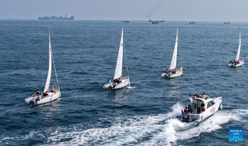 An aerial drone photo taken on July 10, 2025 shows yachts and sailboats participating in a sea cruising event in Laolong Bay area in Qingdao, east China's Shandong Province. A sea cruising event was held in the coastal city of Qingdao on Thursday to celebrate the 20th anniversary of the establishment of the Maritime Day of China and the 620th anniversary of Chinese explorer Zheng He's maritime voyages. (Xinhua/Li Ziheng)