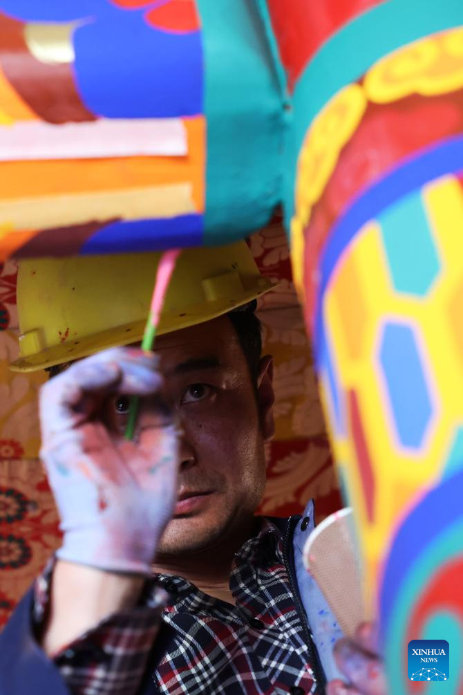 A staff member repairs the oil paintings of the wooden structure at Labrang Monastery in Xiahe County of Gannan Tibetan Autonomous Prefecture, northwest China's Gansu Province, July 10, 2025. After years of renovation, the oil painting protection and restoration of the wooden structure at Labrang Monastery, which serves as a top Tibetan Buddhism educational institution in China, has come near to completion. Some Buddha halls have been opened to the public.