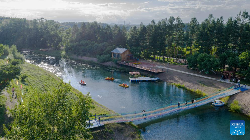 An aerial drone photo taken on July 10, 2025 shows tourists enjoying boating at a forest farm in Yakeshi of Hulun Buir, north China's Inner Mongolia Autonomous Region. In recent years, Yakeshi has leveraged its abundant forest resources to integrate forestry development with tourism, promoting "under-forest" economy to attract tourists. (Xinhua/Ma Jinrui)