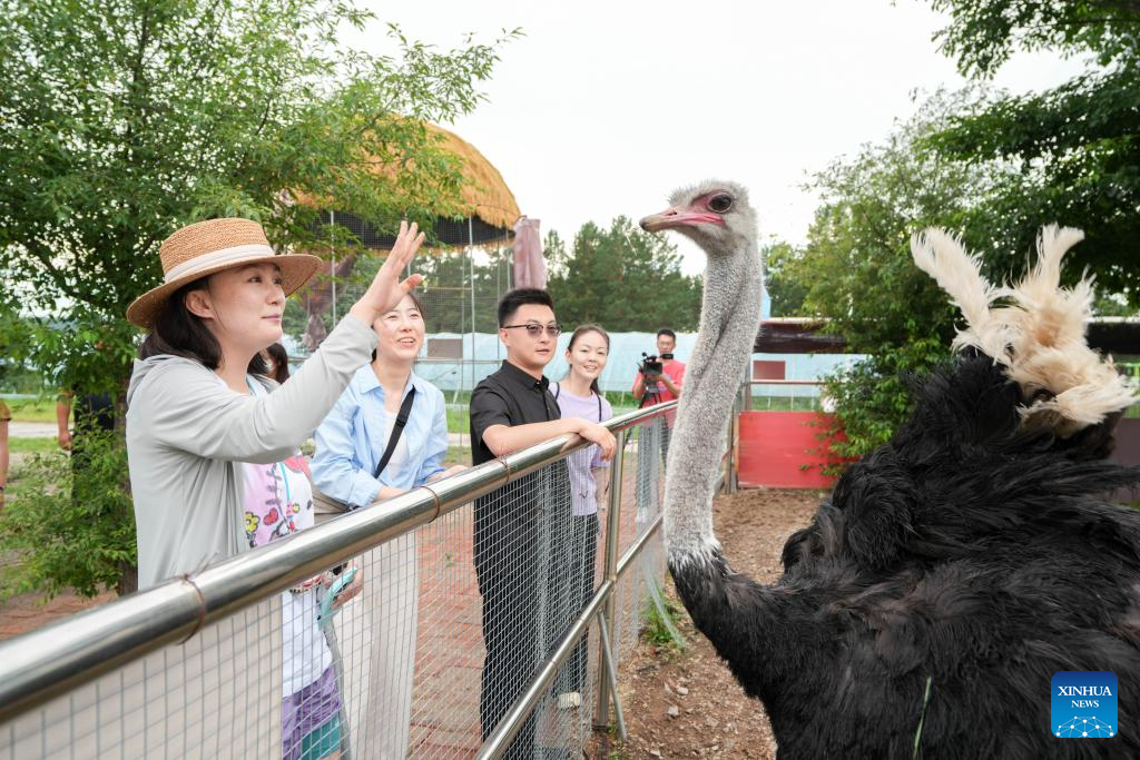 Tourists watch an ostrich at a forest farm in Yakeshi of Hulun Buir, north China's Inner Mongolia Autonomous Region, July 10, 2025. In recent years, Yakeshi has leveraged its abundant forest resources to integrate forestry development with tourism, promoting "under-forest" economy to attract tourists. (Xinhua/Ma Jinrui)