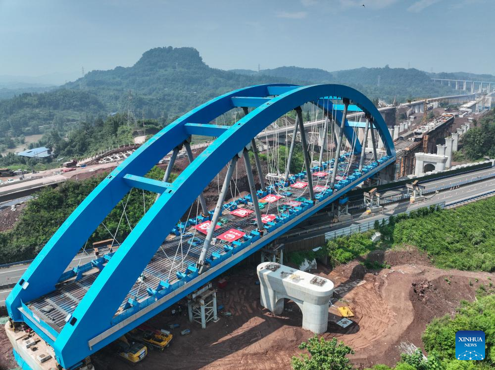The main body of a bridge of Xi'an-Chongqing high-speed railway over an expressway linking Yingshan and Dazhou in Sichuan Province was smoothly lowered onto its piers on Friday. This marks the successful completion of the incremental launching construction for China's first large-span high-speed railway network arch bridge with tied girders, laying a solid foundation for the timely opening of the Xi'an-Chongqing high-speed railway.