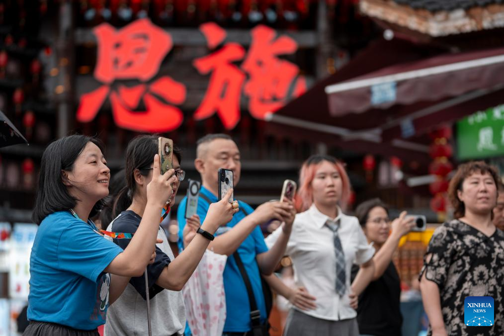 Tourists take photos at Tujia Girls' Town scenic spot in Enshi Tujia and Miao Autonomous Prefecture, central China's Hubei Province, July 8, 2025. Relying on ethnic culture, landscape resources and ecological culture heritage, the tourism market in Enshi continues drawing visitors since the beginning of this summer. (Xinhua/Wu Zhizun)