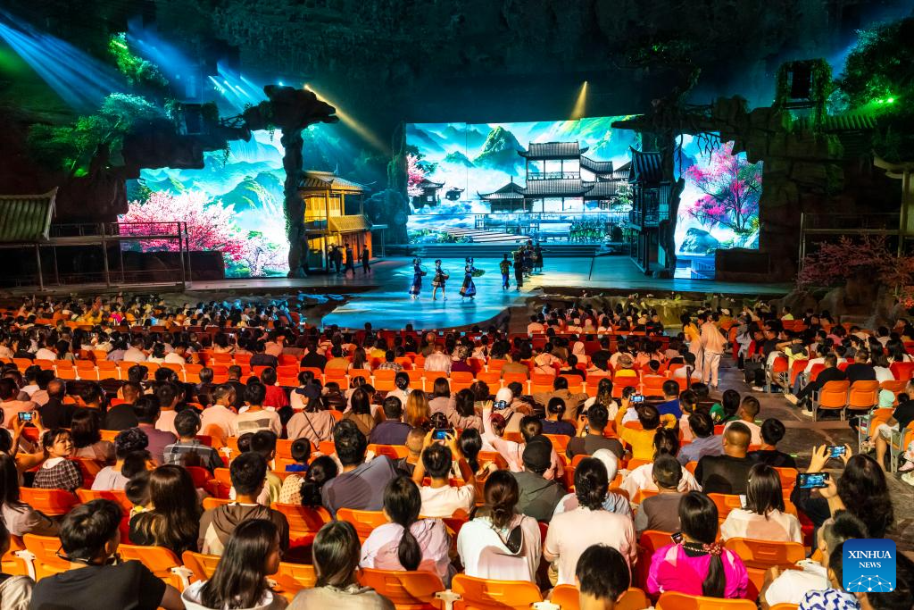 Tourists watch a performance at Tenglong Cave scenic spot in Lichuan City, Enshi Tujia and Miao Autonomous Prefecture, central China's Hubei Province, July 10, 2025. Relying on ethnic culture, landscape resources and ecological culture heritage, the tourism market in Enshi continues drawing visitors since the beginning of this summer. (Photo by Zheng Jiayu/Xinhua)