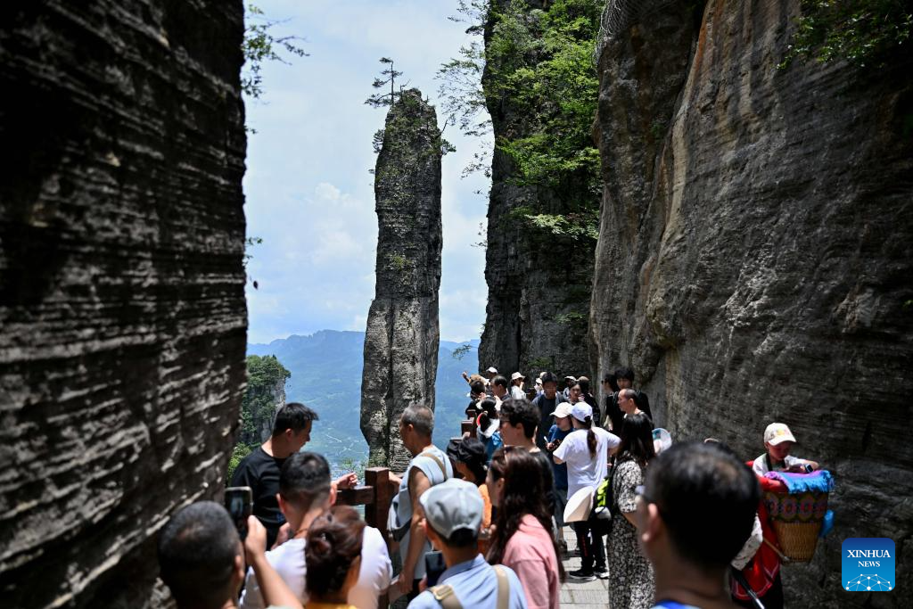 Tourists enjoy the view of Enshi Grand Canyon in Enshi Tujia and Miao Autonomous Prefecture, central China's Hubei Province, July 10, 2025. Relying on ethnic culture, landscape resources and ecological culture heritage, the tourism market in Enshi continues drawing visitors since the beginning of this summer. (Photo by Song Wen/Xinhua)