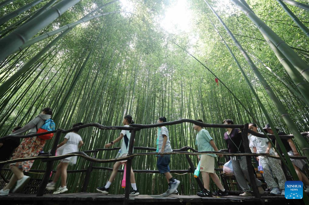 People visit a bamboo forest in Yinan County of Linyi, east China's Shandong Province, July 13, 2025. With heatwaves hitting some Chinese provinces and regions in recent days, the scorching temperature has fueled a cooling economy boom. (Photo by Wang Yanbing/Xinhua)