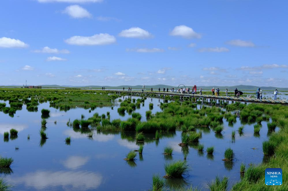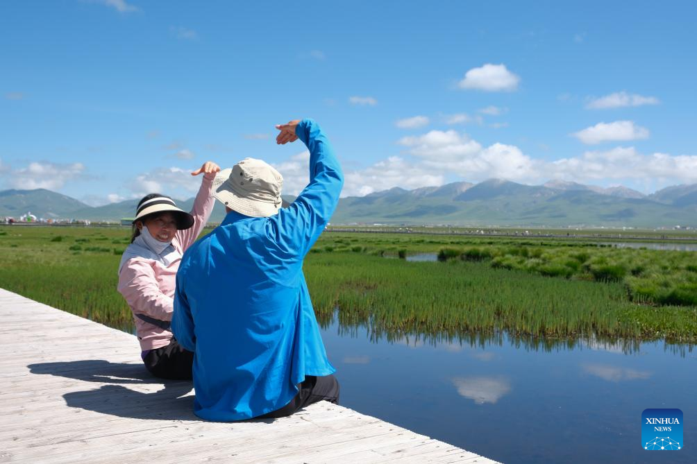 Tourists stroll on a boardwalk of the Flower Lake scenic area in Ruoergai County, Aba Tibetan-Qiang Autonomous Prefecture, southwest China's Sichuan Province, on July 13, 2025. Ruoergai County has recently entered its peak summer tourism season, attracting tourists nationwide. (Xinhua/Tang Wenhao)
