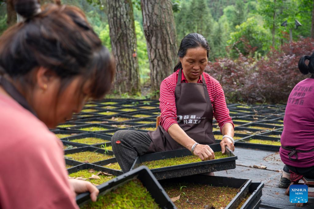 Local people work at a moss planting base in Maoyang Township, Jingning She Autonomous County in Lishui, east China's Zhejiang Province, April 27, 2024. (Xinhua)