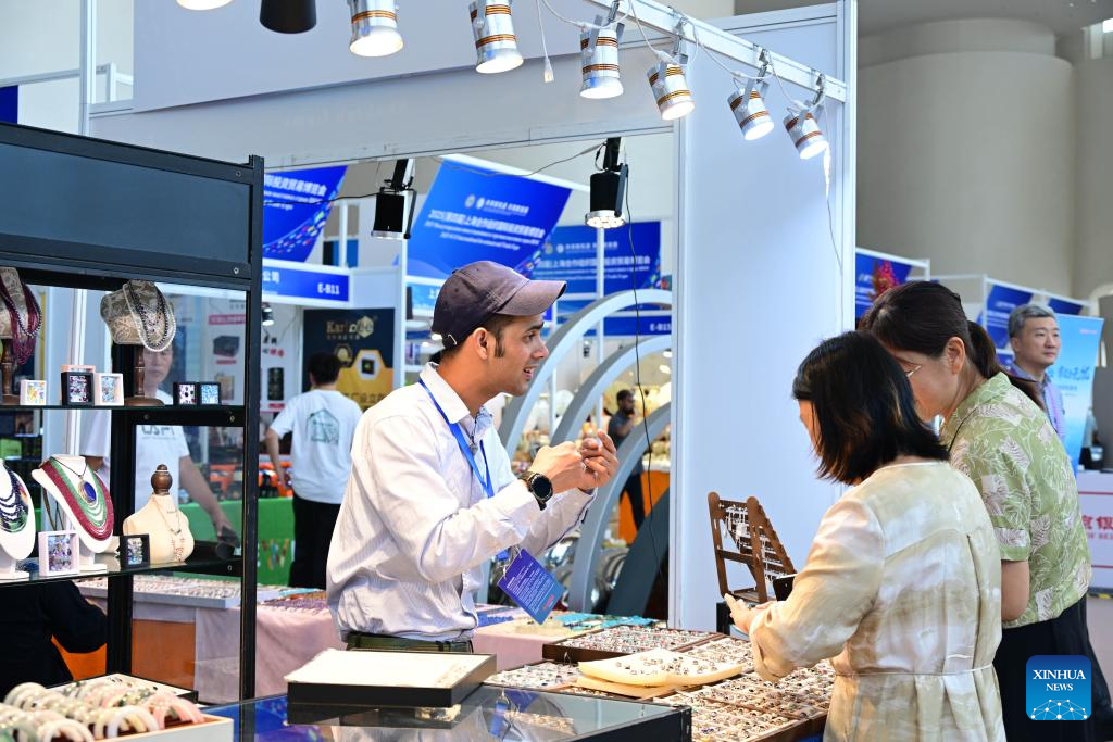 People communicate during the 2025 Shanghai Cooperation Organization (SCO) International Investment and Trade Expo in Qingdao, east China's Shandong Province, July 18, 2025. Under the theme "Sharing New Opportunities, Seeking New Common Development," the expo kicked off on Friday in Qingdao. (Xinhua/Li Ziheng)