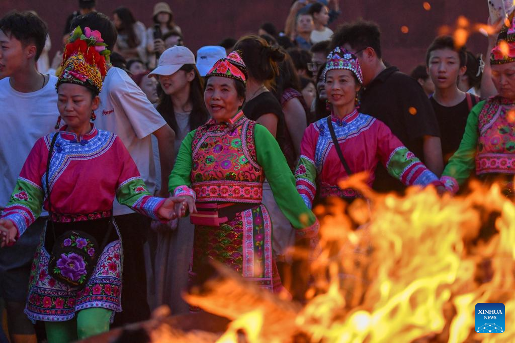 Members of a local Yizu Dage team dance with tourists during a parade show on a square in Weishan Yi and Hui Autonomous County, Dali Bai Autonomous Prefecture, southwest China's Yunnan Province, July 18, 2025. Yizu Dage, a traditional folk art of the Yi ethnic group usually performed during festivals, weddings, funerals and other gathering occasions, has a history of about 10 centuries and was listed as a national-level intangible cultural heritage in 2008. Weishan is dubbed "cradle of Yizu Dage."