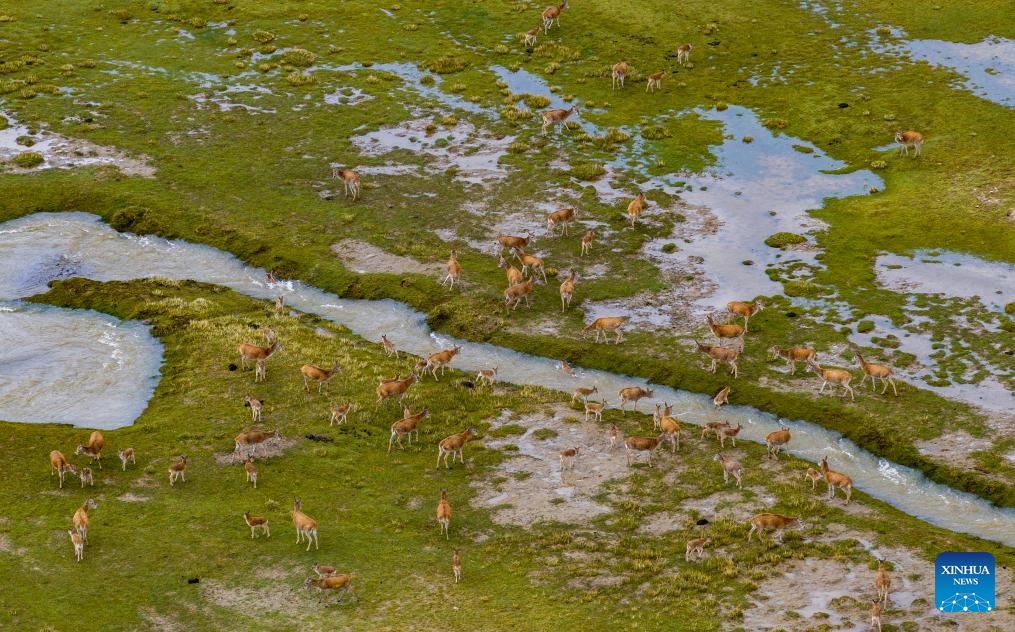 This aerial drone photo shows Tibetan antelopes crossing the Senlong Zangbo River in Changtang National Nature Reserve in southwest China's Xizang Autonomous Region, July 14, 2025. (Xinhua/Jiang Fan)