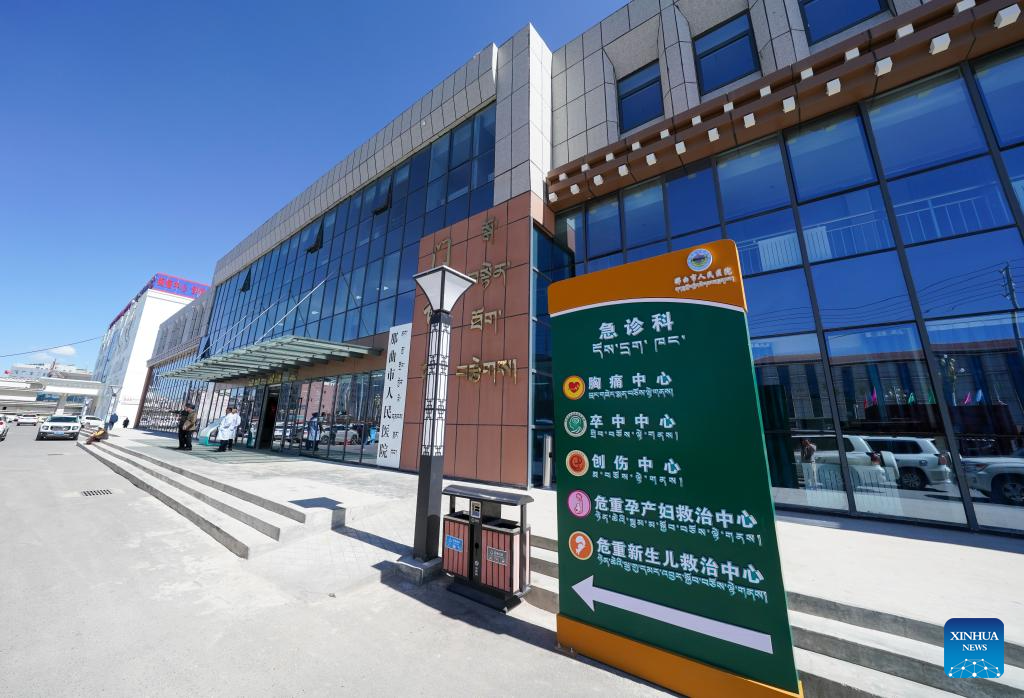 This photo taken on July 18, 2025 shows a general view of Nagqu Renmin Hospital in Nagqu City, southwest China's Xizang Autonomous Region. Since 2016, Liaoning Province has sent 150 medical experts in 9 batches to Nagqu. They have contributed to the training of 225 local medical staff members and the improvement of local medical treatment level. (Xinhua/Jigme Dorje)