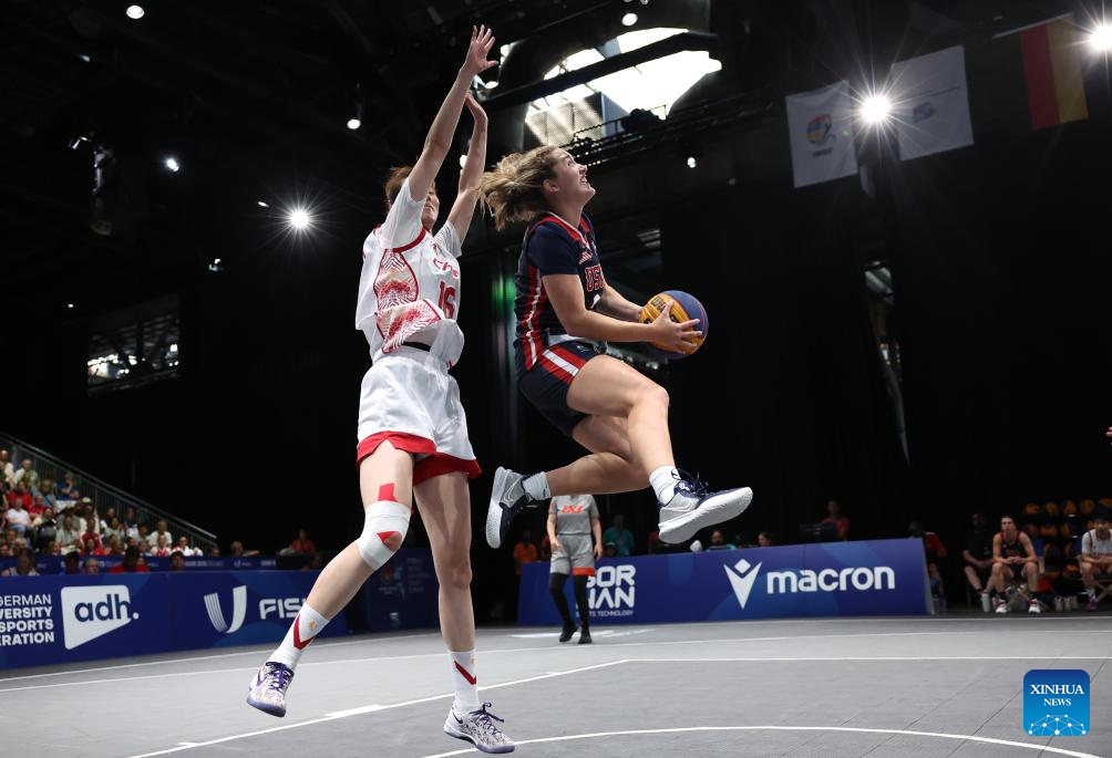 Talya Ann Brugler (R) of the United States goes up for a basket during the women's 3X3 basketball semifinal between China and the United States at Rhine-Ruhr 2025 FISU World University Games in Bochum, Germany, July 20, 2025. (Xinhua/Zhang Chen)