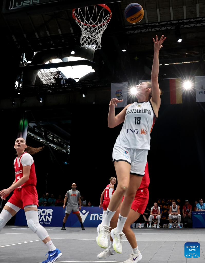 Luisa Marie Nufer (R) of Germany shoots during the women's 3X3 basketball semifinal between Germany and the Czech Republic at Rhine-Ruhr 2025 FISU World University Games in Bochum, Germany, July 20, 2025. (Xinhua/Zhang Chen)