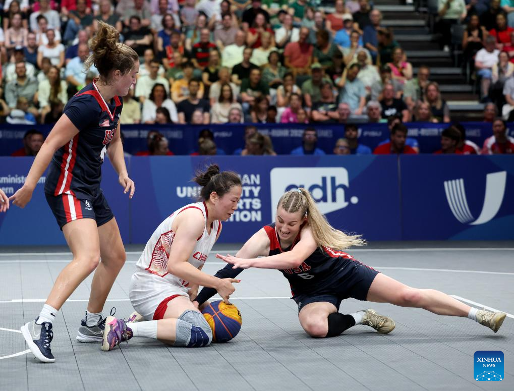 Zhang Tao (C) of China fights for the ball with Lee Jackson Volker (R) of the United States during the women's 3X3 basketball semifinal between China and the United States at Rhine-Ruhr 2025 FISU World University Games in Bochum, Germany, July 20, 2025. (Xinhua/Zhang Chen)