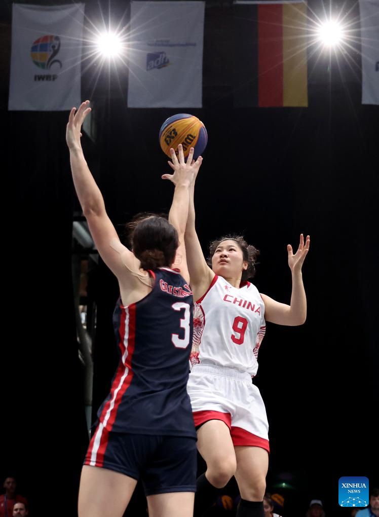 Cecelia Mary Collins (R) of the United States shoots during the women's 3X3 basketball semifinal between China and the United States at Rhine-Ruhr 2025 FISU World University Games in Bochum, Germany, July 20, 2025. (Xinhua/Zhang Chen)