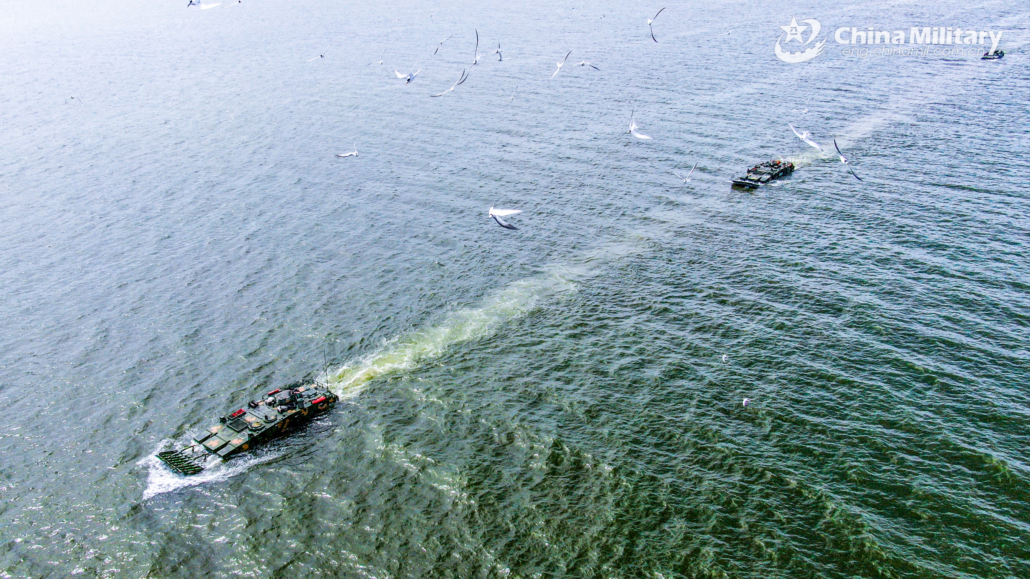 Amphibious armored infantry fighting vehicles (IFV) attached to a brigade with the Chinese PLA Army maneuver towards the designated area during a ferrying and assault wave formation training exercise on July 6, 2025. (eng.chinamil.com.cn/Photo by Zhang Mao)