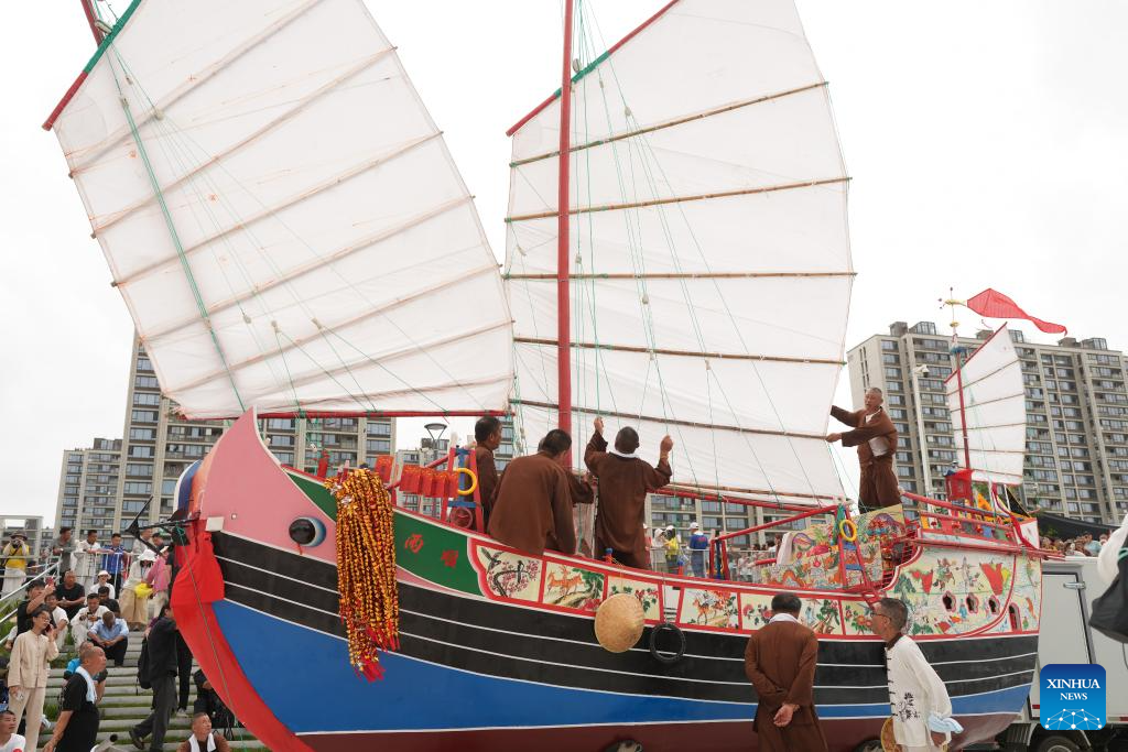 People parade with a ceremonial boat during a traditional ceremony on the occasion of the Dashu solar term in Taizhou, east China's Zhejiang Province, July 22, 2025. People in coastal areas of Taizhou gathered here on Tuesday to hold a traditional ceremony on the occasion of Dashu, or the Great Heat, the 12th of traditional Chinese 24 solar terms. They paraded with a ceremonial boat, shaped like a traditional three-masted vessel, through villages and then burned it after hauling it away from the fishing harbor. In 2021, this ceremony was listed as a national intangible cultural heritage. (Xinhua/Weng Xinyang)