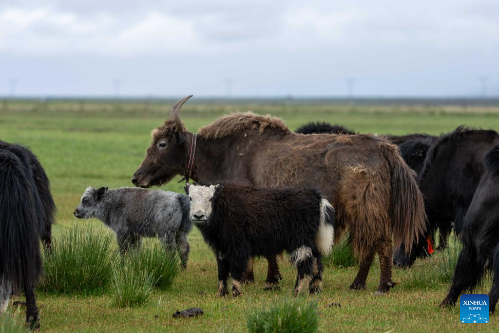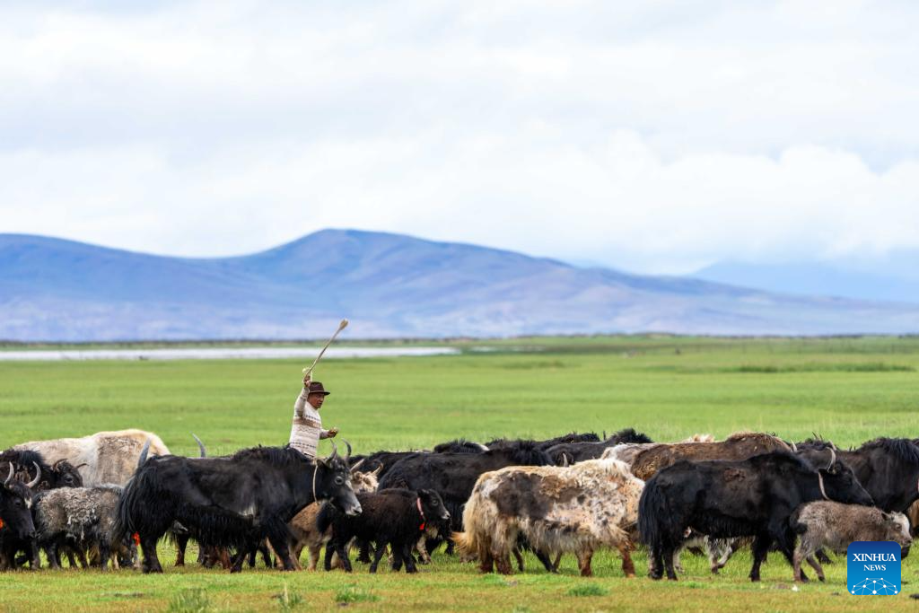 This photo taken on July 22, 2025 shows a herd of yaks in a wetland near Mapam Yumco Lake in Burang County of Ngari Prefecture, southwest China's Xizang Autonomous Region. (Xinhua/Tenzing Nima Qadhup)