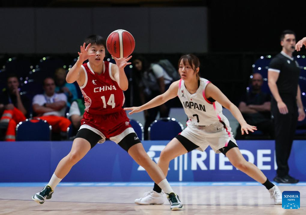 Cao Boyi (L) of China grabs the ball during the women's basketball quaterfinal match between China and Japan at the Rhine-Ruhr 2025 FISU World University Games in Essen, Germany, July 22, 2025. (Xinhua/Zhang Fan)