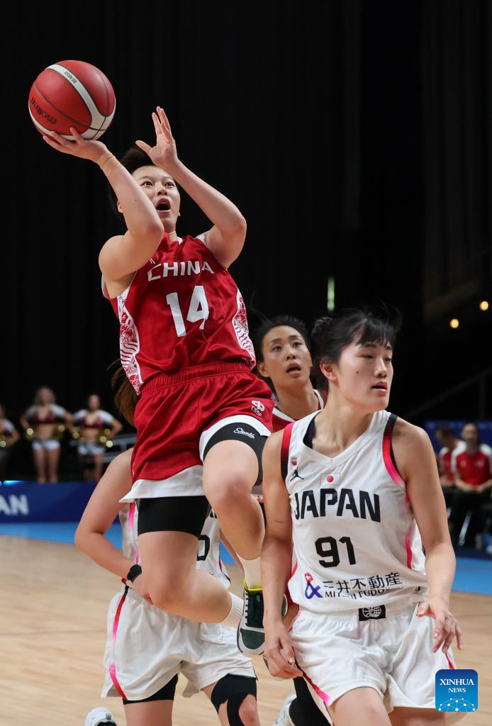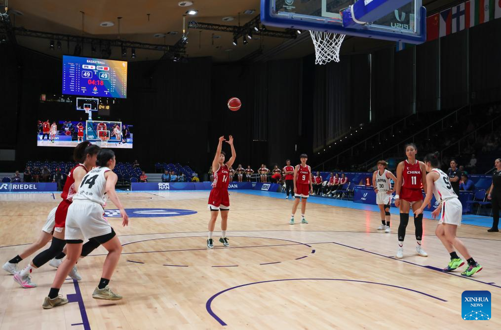 Tang Ziting (C) of China shoots during the women's basketball quaterfinal match between China and Japan at the Rhine-Ruhr 2025 FISU World University Games in Essen, Germany, July 22, 2025. (Xinhua/Zhang Fan)