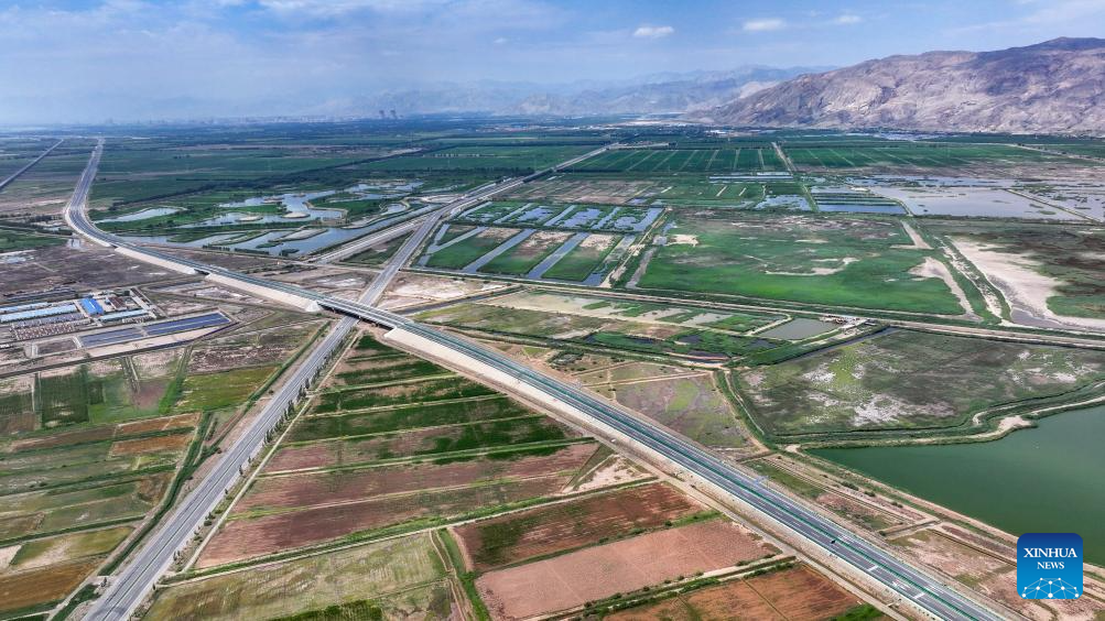 An aerial drone photo taken on July 22, 2025 shows a view of the Huinong-Shizuishan section of the Wuhai-Maqin expressway in Shizuishan, northwest China's Ningxia Hui Autonomous Region.