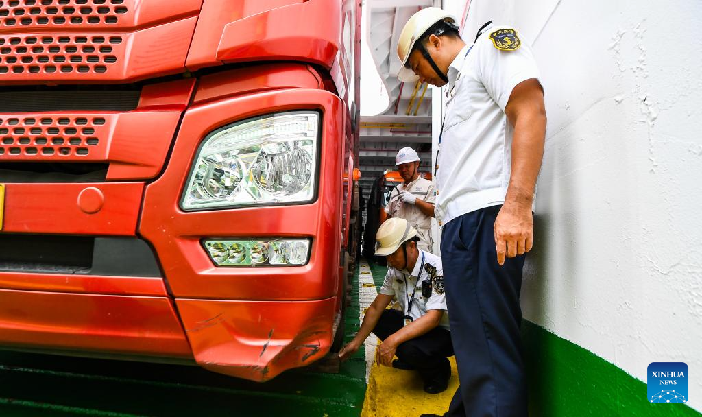 A truck drives into a ferry ship at Xiuying Port in Haikou, south China's Hainan Province, July 22, 2025. The passenger and freight ferry service in the Qiongzhou Strait has been resumed in an orderly manner as the impact of Typhoon Wipha weakens. (Xinhua/Yang Guanyu)
