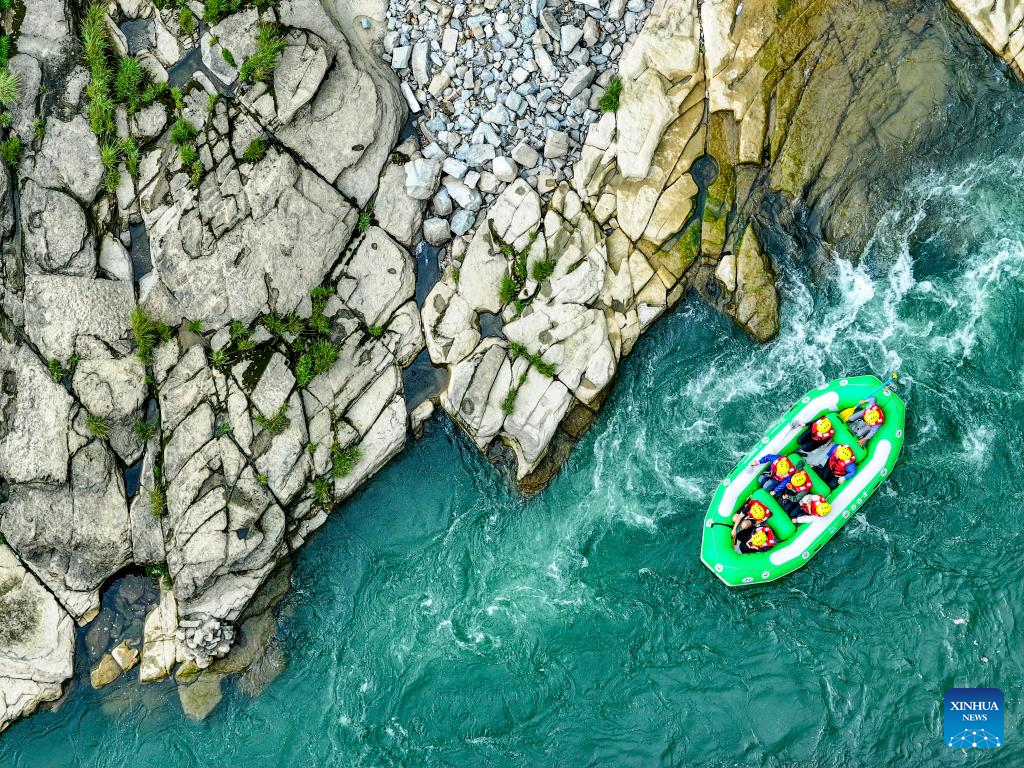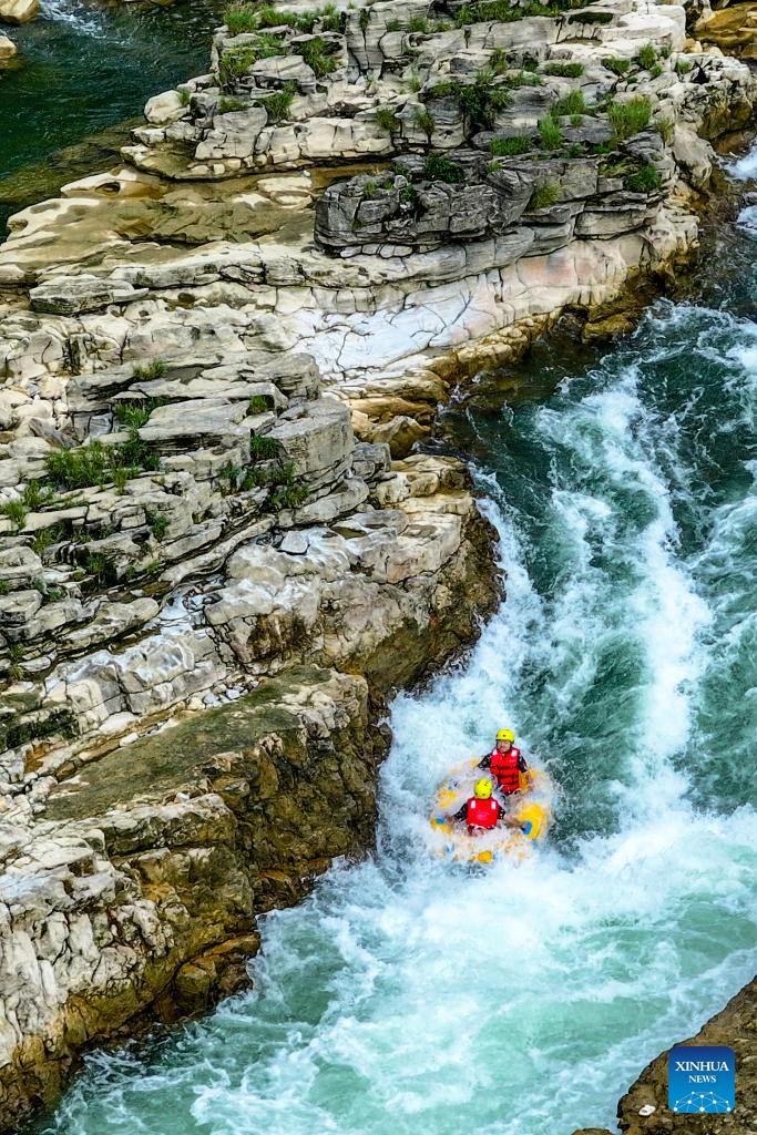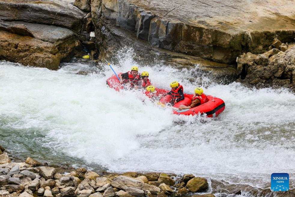 This photo taken on July 21, 2025 shows people rafting in inflatable boats on Luobei River in Guiding County, southwest China's Guizhou Province. (Xinhua/Ou Dongqu)