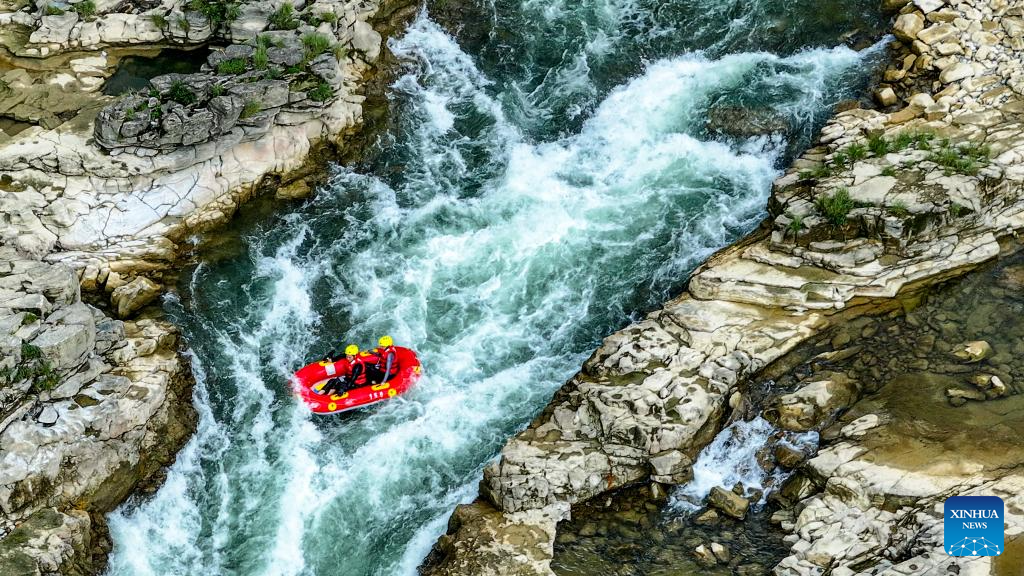 This photo taken on July 21, 2025 shows people rafting in an inflatable boat on Luobei River in Guiding County, southwest China's Guizhou Province. (Xinhua/Ou Dongqu)