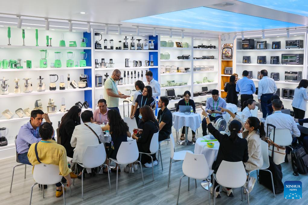 Filed photo taken on April 15, 2025 shows clients learning about the products of Xinbao Electric Appliances Holdings Co., Ltd. during the 137th Canton Fair in Guangzhou, south China's Guangdong Province. In the first five months of 2025, Guangdong's import and export volume reached 3.75 trillion yuan (about 521 billion U.S. dollars), marking a four-percent increase year on year and outpacing the national level by 1.5 percent. In recent years, private enterprises in Guangdong have been pursuing a quality-oriented development model while actively expanding their presence in international markets.