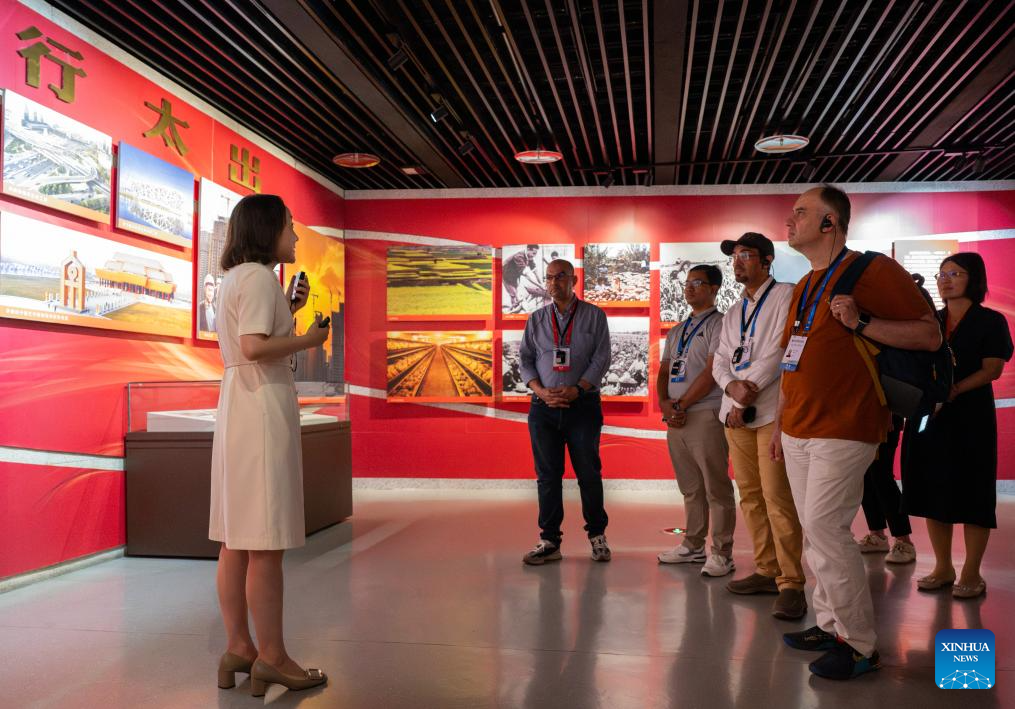 Participants of the Shanghai Cooperation Organization (SCO) Media and Think Tank Summit visit Hongqi Canal Museum in Linzhou City, central China's Henan Province, July 26, 2025. The SCO Media and Think Tank Summit is held in Zhengzhou from July 23 to 27. Participants are invited to visit various locations in Henan during the summit. (Xinhua/Hu Jingwen)